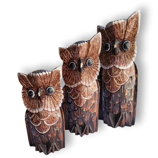 Trío de Búhos en madera de 25cm. - 20cm. - 14cm.
